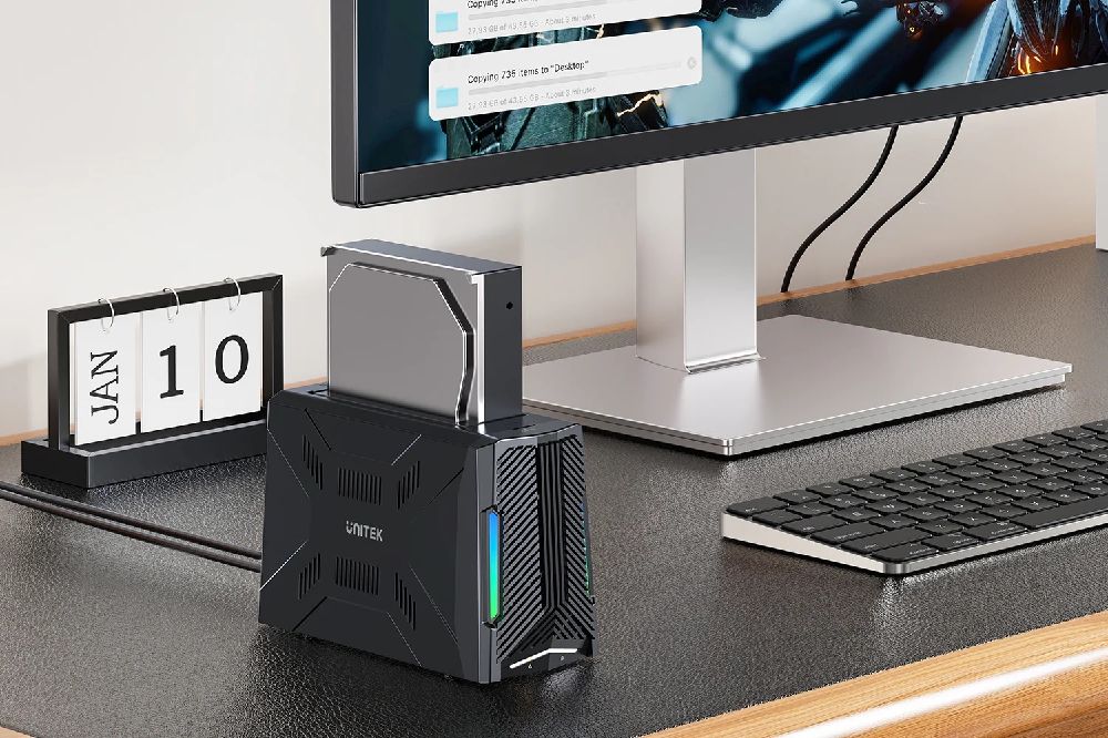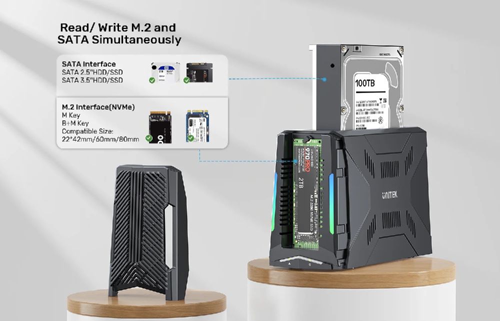 Combines a modern, compact design with practical functionality, seamlessly fitting into any workspace. It supports efficient data transfers for 2.5”/3.5” SATA SSDs/HDDs and M.2 PCIe SSDs, making it perfect for managing large files, gaming, or media playback. With its stylish look and reliable performance, it enhances both productivity and aesthetics on your desk.