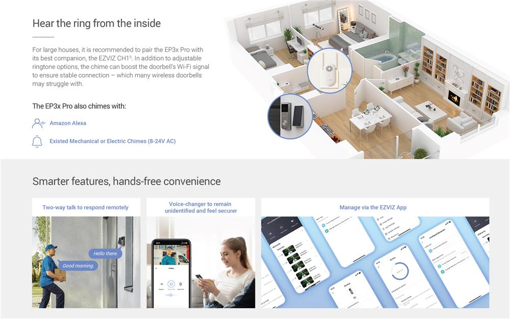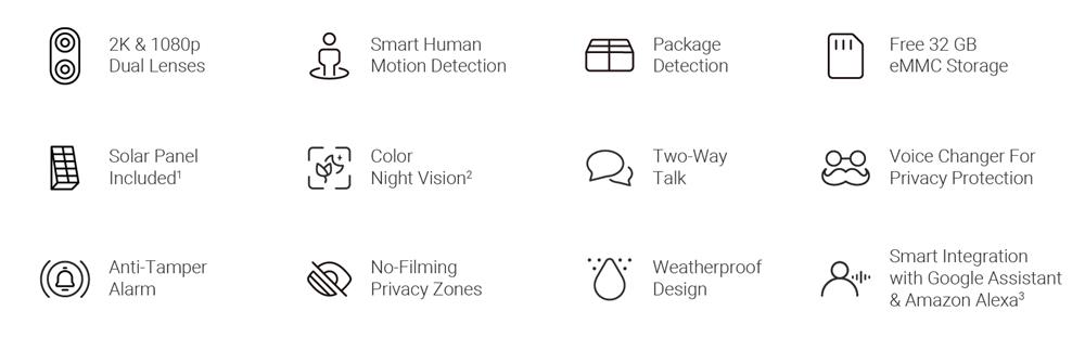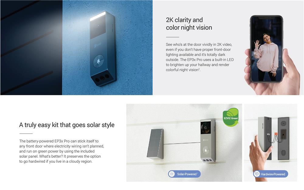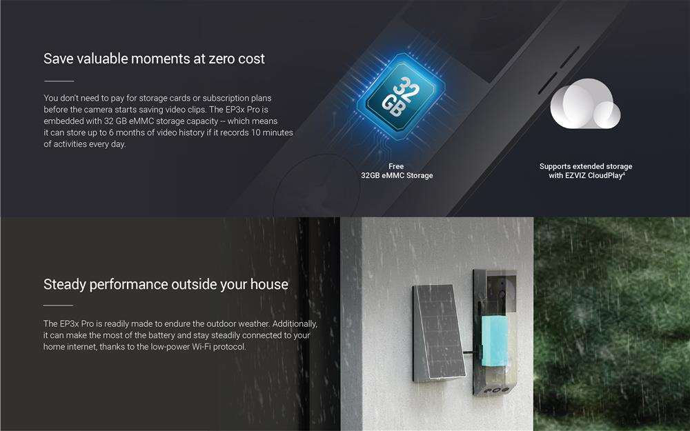 Introducing EZVIZ’s first dual-lens video doorbell with unparalleled vision, complex detection features, and an easy solar charging option. Combining a 2K main camera and a 1080p bottom camera, the EP3x Pro detects both moving people and delivered packages to help you smartly watch over your front door. It’s also a kit that you can truly set and forget — it comes with free, built-in 32GB eMMC storage capacity, and uses the included solar panel to run on green energy.