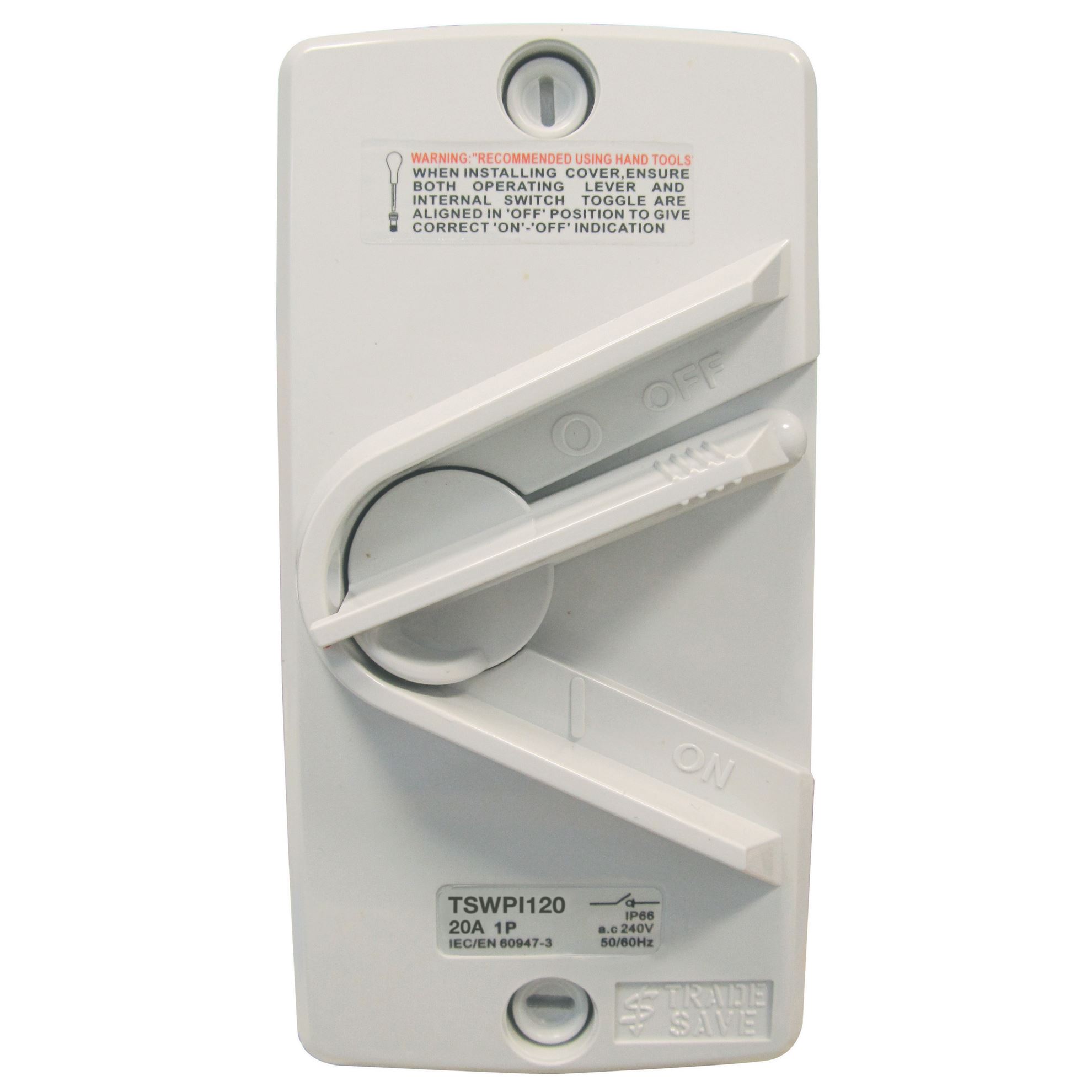 TRADESAVE Weatherproof Isolator 1 Pole 240V 20A. Grey Heavy Duty Industrial Grade Virgin Plastic. IP66 Rating. UV Stabilised. Surface Mount. Rated voltage: 250/440V AC.